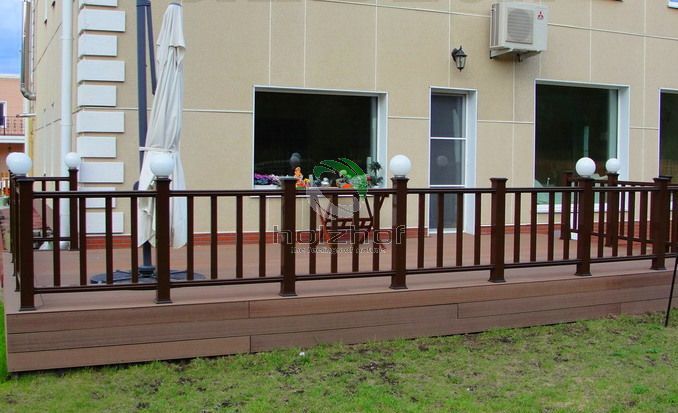 В связи с тем, что терраса находится под открытым небом, а проходимость по ней небольшая, то решено было сделать монтаж из шовной террасной доски Holzhof коричневого цвета.
