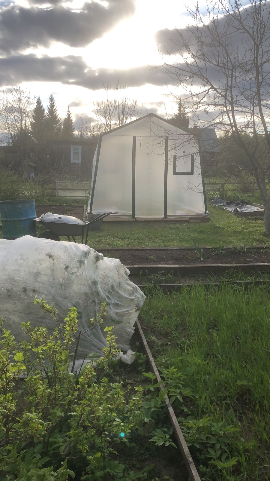 По низу добавлен материал пленки, чтобы чехол доставал до земли. Но все равно мы рекомендуем обустроить низ теплицы фундаментом из бруса или толстой доски, чтобы было к чему крепить и прижимать чехол.